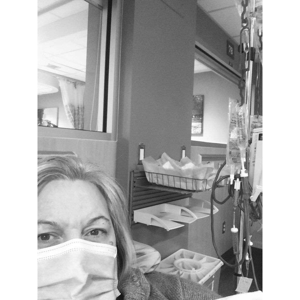 With a quick flush of my IV lines, the next drug was up to bat – Carboplantin. Jacine gowned up, I was tested again (a bit slower in the response this time thanks to my drug haze), Tom popped in and did his thing, and my husband stared at me for 10 minutes waiting for the next shoe to drop. But there no was dropping of ANY shoes as I sailed through the full bag with no drama!