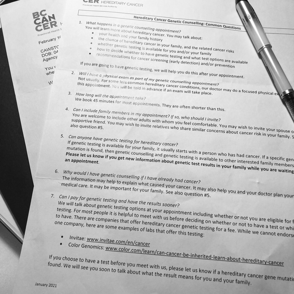 Additionally, I made a list of everyone I needed to advise of my genetic outcomes so I could let them know, explain what it means, and allow them to determine their own testing “next steps”.